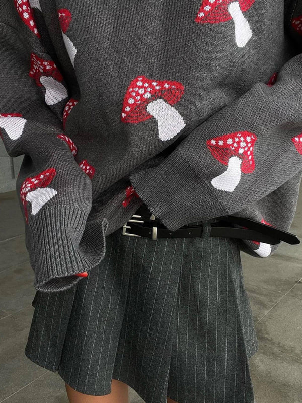 Mushroom jacquard sweater loose contrast color pullover knit sweater